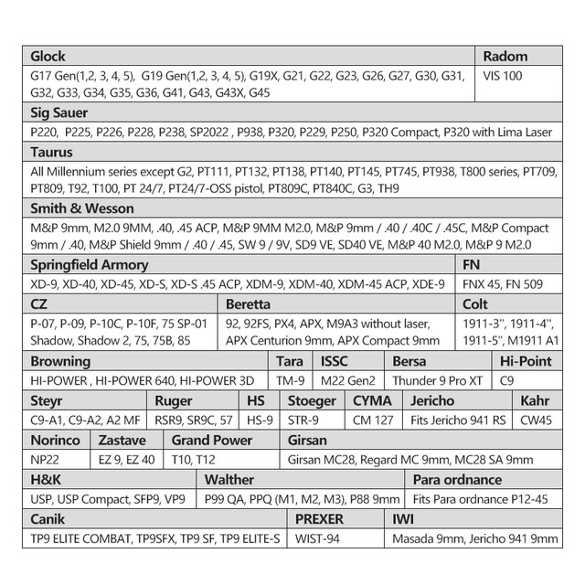 - моделі Glock 17, 19 , Beretta , Sig Sauer, CZ, Taurus Форт 17, АПС